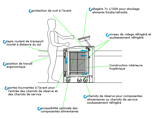 Le portionnement individuel consiste à travailler avec un système de portionnement réfrigéré où tout le repas est portionné. Le système peut être organisé de façon flexible à l’aidede modules mobiles/opérationnels. Pour le transport des repas à portionner, vous pouvez utiliser un rail de guidage ou, éventuellement, un chariot.